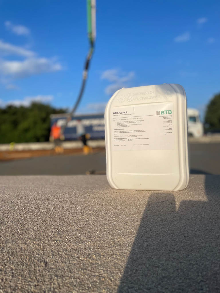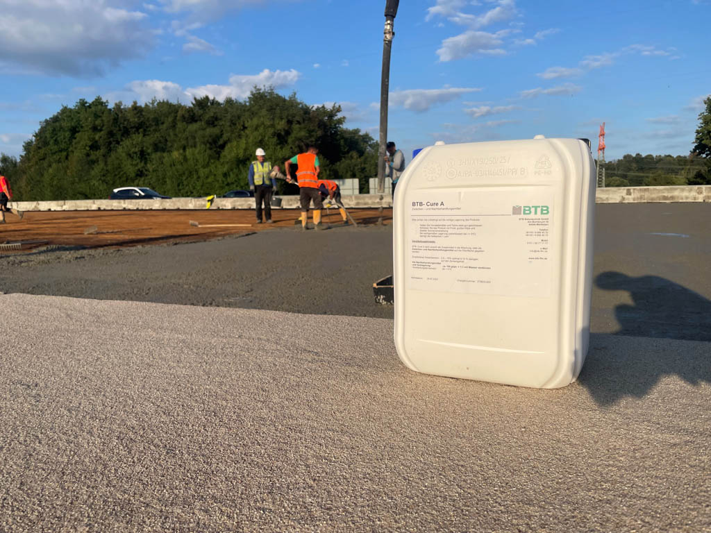Das Aufsprühen von BTB- Cure- A ist eine rationelle Zwischen- und Nachbehandlungsmethode für frische Betonoberflächen. Der Beton wird wirksam gegen ein vorzeitiges Verdunsten geschützt.